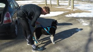 Canicross: Tout comme ci-dessus, plus mettre le harnais de canicross à Luna, mettre la ceinture de canicross. Et si vous n’avez pas un endroit sympa pour aller faire du canicross à proximité, il faut mettre les équipements de canicross dans un sac de sport, préparer l’eau et la gamelle, sortir Luna faire ses besoins, et ensuite on peut y aller.