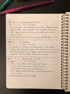 Bon et parce que je suis une malade de l’organisation et je n’essaie même pas de le nier, je ne voulais pas avoir deux cahiers, mais plutôt tout garder au même endroit. J’ai donc recopié tous les entrainements de l’ancien cahier vers le nouveau. Oui je sais je suis folle. Bref. Ca m’a fait relire les premiers entrainements qu’on a fait avec Luna, et me rendre compte des progrès qu’elle a fait. Elle n’a commencé à courir qu’en février 2018, donc ça ne fait même pas un an et elle a déjà fait tellement de progrès! Elle a vraiment un grand potentiel et j’ai hâte de voir ce qu’elle va donner l’année prochaine avec encore plus d’expérience.