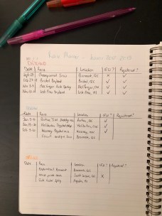 This is where I keep the information about our accommodation for races. I would record the hotel name, the check in and check out dates, the rate, room type, and confirmation number. That way, I make sure that I have our accommodation booked in advance to secure a good rate, and not forget about it and having to book last minute.